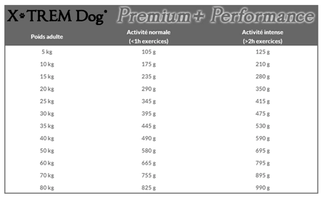 RATION JOURNALIÈRE : La ration quotidienne conseillée est indiquée dans le tableau ci-dessous, en moyenne le besoin du chien varie de 15 à 25g d’aliment par kilo. La dose journalière conseillée est à adapter si besoin en fonction de l’âge, des performances, de la condition physique et de la saison.
